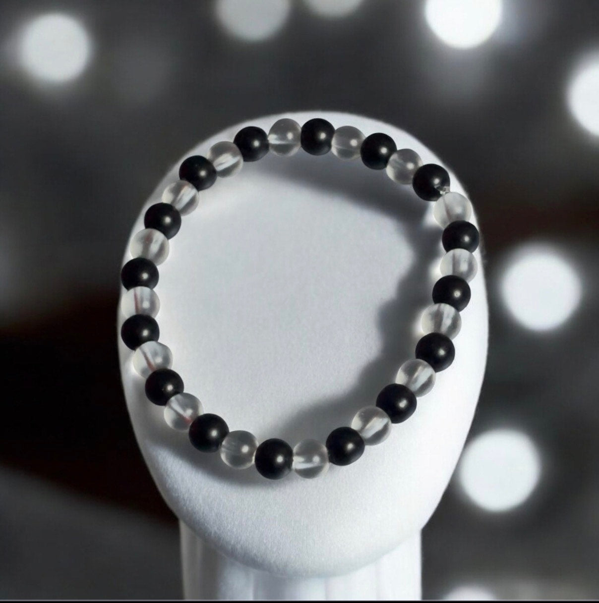 This black and transparent beaded bracelet combines sleek style with subtle elegance. Its versatile design complements any outfit, making it perfect for everyday wear or special occasions. Lightweight and comfortable, it adds a refined touch to your look.