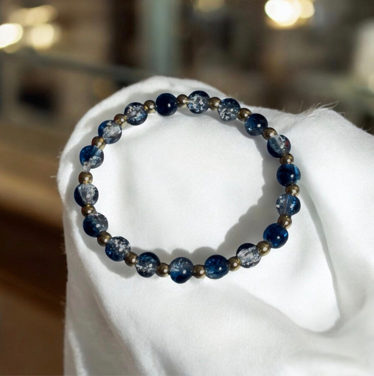 This elegant elastic stretchy bracelet features blue and silver transparent beads, creating a subtle yet striking accessory to complement any outfit. Its lightweight design ensures comfortable all-day wear while adding a touch of refined beauty to your look.