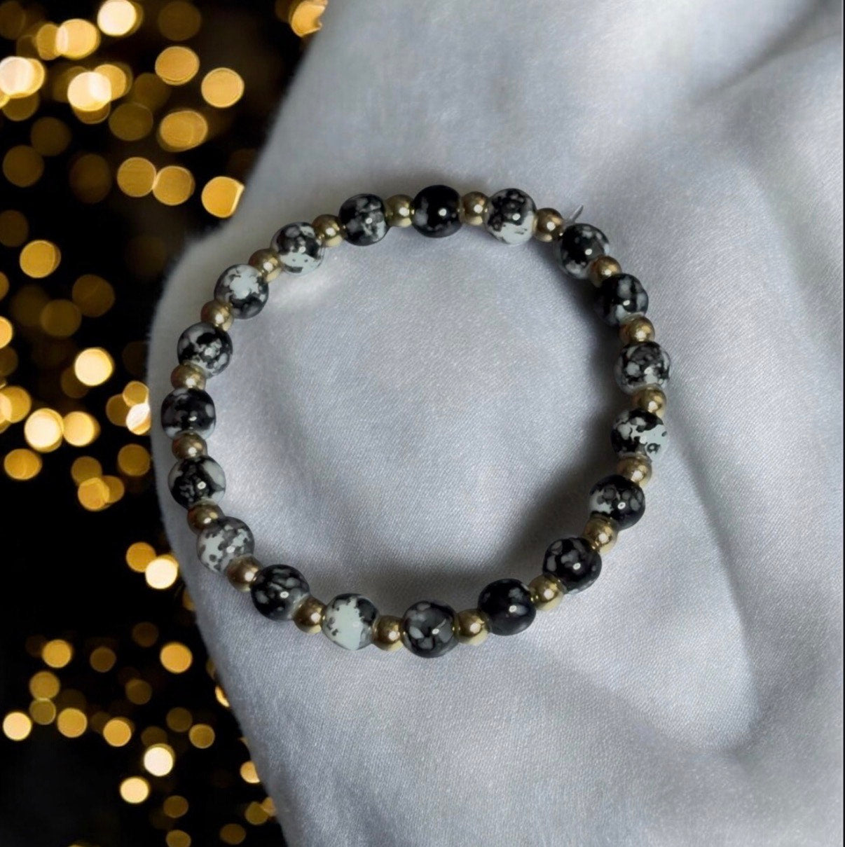 This elegant marble-inspired bracelet features gold elastic bands and stretchy beaded accents, offering a comfortable fit and a sophisticated touch to any outfit.