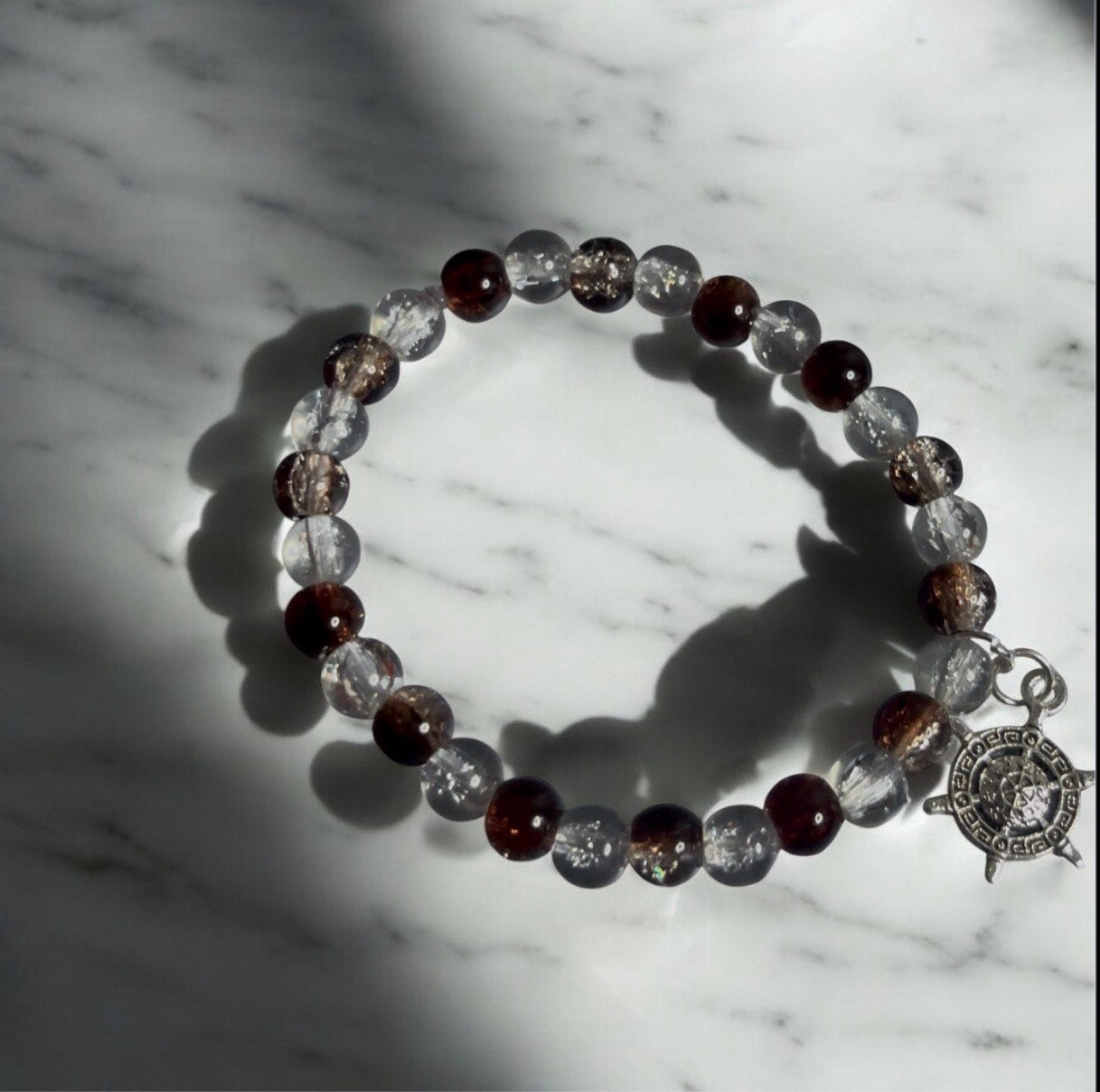 This Transparent Brown beaded charm bracelet blends subtle elegance with everyday style. Its versatile colour complements any outfit, while the charming beads add a touch of personality to your wrist. Perfect for layering or wearing solo.